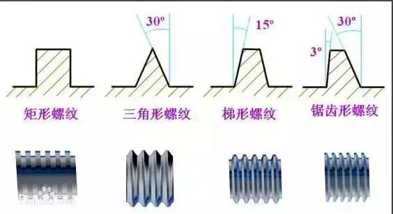 螺紋按其截面形狀(牙型)分為三角形螺紋、矩形螺紋、梯形螺紋和鋸齒形螺紋等。