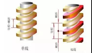 雙線螺紋:雙線螺紋又叫雙頭螺紋,指圓柱上有兩條螺旋線。