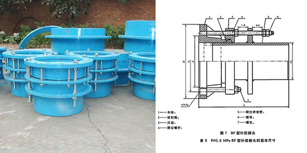 BF型單法蘭松套限位補償接頭是在AF型法蘭松套補償接頭的基礎上增設限位伸縮管及限位螺柱而成,最大伸縮量處用雙螺母鎖定,補償因熱脹冷縮和地基沉降引起的管線軸向位移及撓曲和偏心,從而保護閥門的設備。