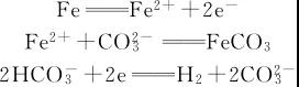 總體而言, Q345R 和 14Cr1MoR 兩種材料在單一的碳酸鹽溶液中 SCC 敏感性較低,溫度的影響不如碳酸鹽介質(zhì)的影響大。 Q345R 材料在 90℃ 下 80g·L-1的 NaHCO3溶液中,表面出現(xiàn)許多蝕孔,隔熱管托能譜顯示成分接近鋼材本體,表面無(wú)腐蝕產(chǎn)物膜存在,初步認(rèn)為表面發(fā)生了較為嚴(yán)重的 Fe 的溶解,在該溶液條件下發(fā)生了以下反應(yīng):