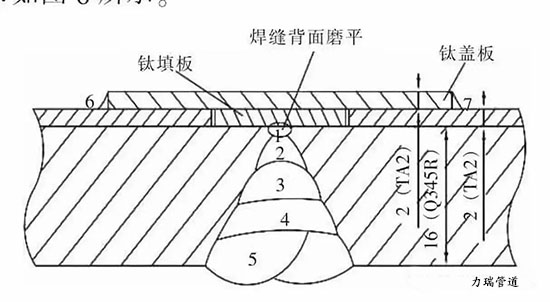 焊接時采用的坡口形式如圖6所示。坡口加工一般采用冷加工方法,也可以采用等離子弧切割的加工方法,加工坡口時應注意對鈦覆層表面的防護。坡口加工結束后,應對坡口兩側及鈦覆層表面進行檢查,如果發現鈦覆層表面有劃傷或損傷,應及時進行修補。鈦復合板應先焊接碳鋼基層焊縫,檢驗合格后,再焊接鈦覆層焊縫。以基材鋼板厚度為16 mm,鈦覆層板厚度為2 mm的鈦復合板為例,焊道排布如圖6所示。