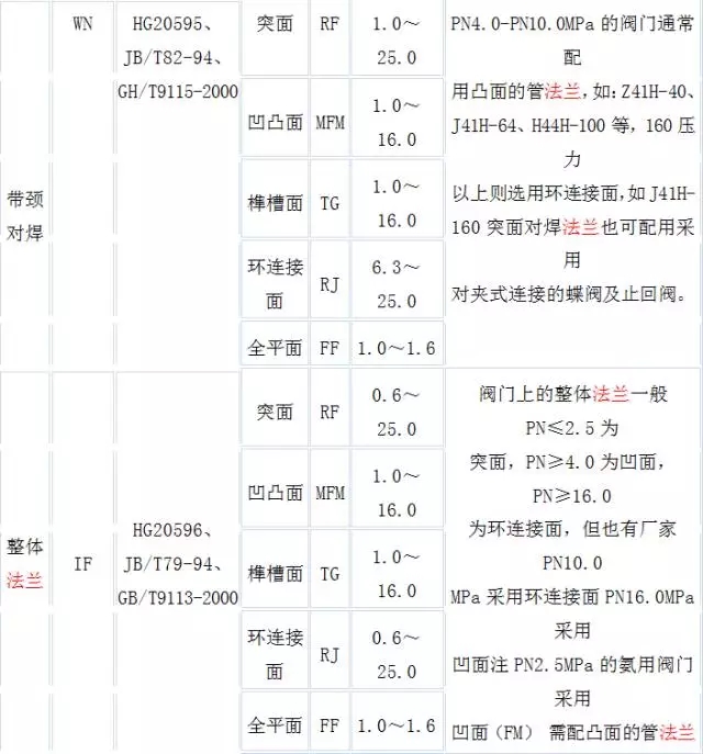 帶頸對焊法蘭的密封面形式有:突面(RF)、凹面(FM),凸面(M)、榫面(T),槽面(G),全平面(FF)。