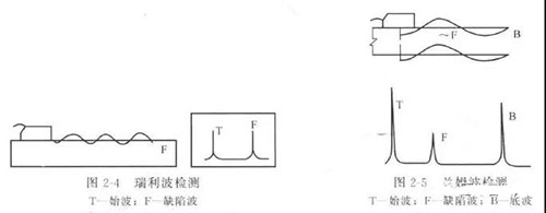 c. 瑞利波檢測 當工件厚度大于所用波長時,屬瑞利波檢測。用來發現近于或處于工件表面并垂直工件表面的缺陷(圖2 -4 ) 。