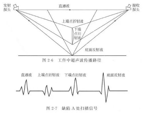 d. 蘭姆波檢測 當工件厚度小于所用波長時,屬蘭姆波檢測。用來檢驗近于表面并平行于工件表面的淺傷(圖2-5 ) 。