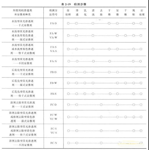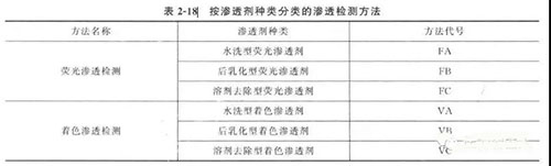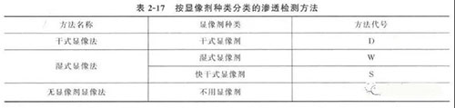 根據顯像劑和滲透劑種類不同,滲透檢測方法的分類見表2 - 17 和表2 - 18 ,各種方法組合使用的檢測步驟見表2 - 19 。