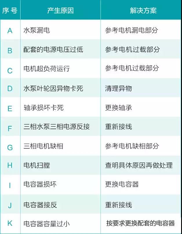 處理方法:檢查電路電壓,降低水泵轉速;矯正水泵主軸或調整水泵與電機的相對位置;選用合適揚程的水泵;清理泥沙或堵塞物;更換電機的滾珠軸承。