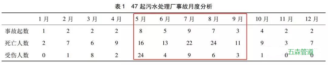 夏季是污水處理廠有毒氣體產生的高峰季節,也是污水處理廠事故高發的季節,之前作者也建議,不要在夏季去做一些清淤之類的無關生產的小事,可是一些管理人員安全意識淡薄,導致了很多生命的消逝!《我國污水處理廠事故統計分析與對策研究》[1]中統計了10年間的47例污水處理事故并做了分析: