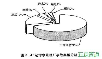通過對我國污水處理廠事故發生的類型進行統計和分析可以看出的是污水處理廠事故的類型主要是:中毒窒息、坍塌、淹溺、爆炸、觸電、透水等,而其中最主要發生的事故類型是中毒窒息事故,發生的概率是70%。就引起中毒事故發生的原因來看,硫化氫是引起中毒事故的主要原因,沼氣是引起窒息事故的主要原因。而且中毒事故中容易對工作人員造成人員傷害的主要原因是個人的防護用品失去了效果或者并沒有按照規定在作業期間使用防護用品。而且污水處理廠設備出現缺陷、錯誤的操作、設施沒有達到規定的標準、通風不良等都是造成人員傷亡的原因,但是個人防護用品的使用是引起中毒窒息事故中人員傷亡的主要原因,發生率高達78%。