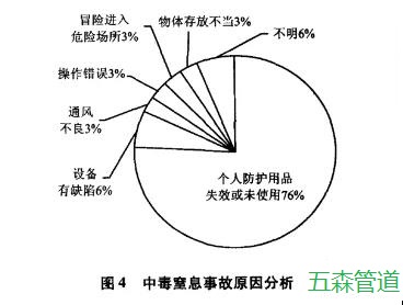 通過對總事故中中毒窒息事故的分析與統計我們可以看出,工作人員的個人防護用品沒有按照規定檢查失效,以及沒有使用是事故造成人員傷亡的主要原因,占總數的78%,污水處理廠運行的設備有缺陷也是造成事故中人員傷亡的原因之一,占總數的7%。由于通風不良、或者錯誤的操作、在有危險的情況下冒險進入危險場所、物品存放不恰當等這些原因也都是會引起中毒窒息事故的發生的,就上述情況來看,為了減少中毒窒息對人員傷亡事故的發生,保證工作人員的防護用品有效、并且正確的使用是關鍵的手段。