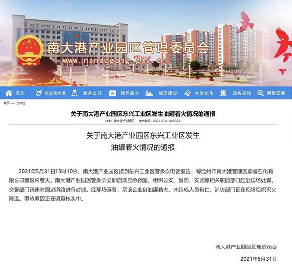 據河北滄州市南大港產業園區管理委員會官網消息,5月31日15時10分,南大港產業園區接到東興工業區管委會電話報告,稱滄州市南大港管理區鼎睿石化有限公司罐區內著火,南大港產業園區管委會立即啟動應急預案,組織公安、消防、安監等相關職能部門趕赴現場處置,交警部門迅速對周邊道路進行封鎖。經現場查看,系該企業儲油罐著火,未造成人員傷亡,消防部門正在現場組織滅火降溫。事故原因正在調查核實中。