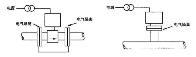 5、當被測流體不接地時,電磁流量計應與工藝管道絕緣隔離,其電源及輸出信號應采用變壓器隔離,如圖4所示。