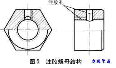 4、螺紋連接部位泄露的密封方法 隔熱管托將卡蘭卡在螺紋泄露部位的外表面,用頂絲頂緊,通過頂絲內孔,用約直徑為3--4mm的長鉆頭鉆透陰螺紋壁,然后裝上注射槍注入少量密封劑,即能迅速消除泄露。