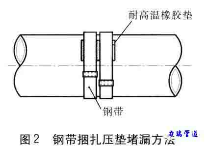 用厚度1--2mm的不銹鋼帶在泄露法蘭付的外圓上扎上一圈,代替法蘭夾具。它僅適用于壓力2MPa以下的泄露點,其施工步驟是: