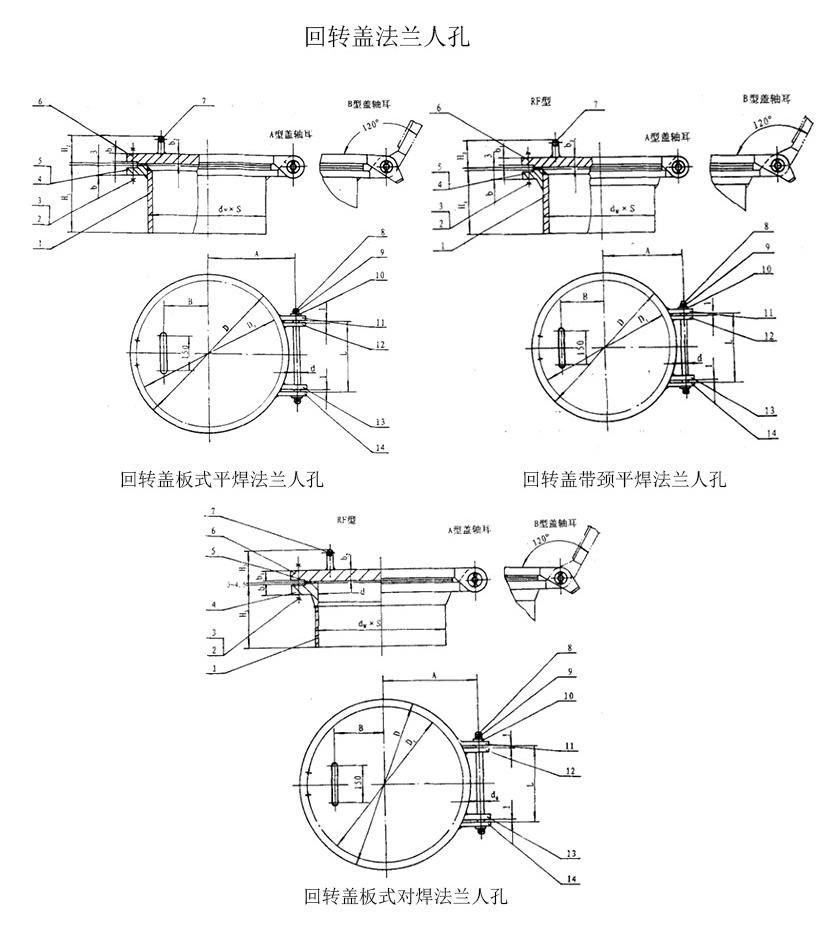 回轉蓋板式平焊法蘭人孔、回轉蓋帶頸平焊法蘭人孔、回轉蓋帶頸對焊法蘭人孔