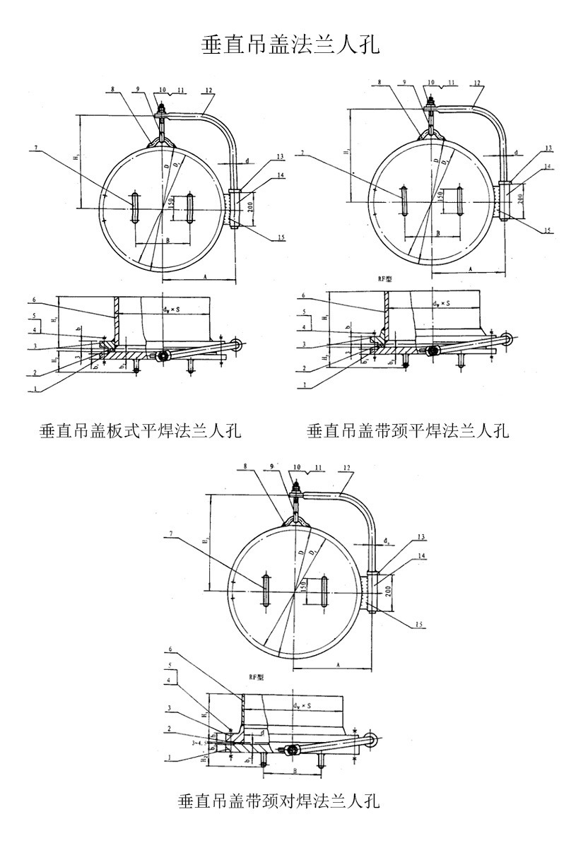 垂直吊蓋板式平焊法蘭人孔、垂直吊蓋帶頸平焊法蘭人孔、垂直吊蓋帶頸對焊法蘭人孔